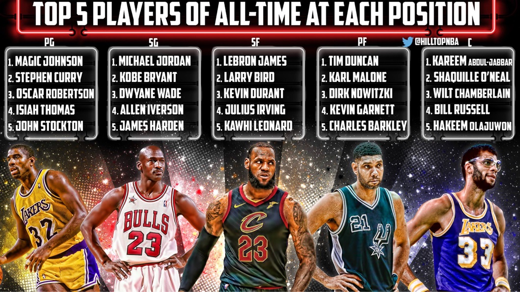 小前锋位置由詹姆斯领衔,伯德、杜兰特、朱利叶斯-欧文和莱昂纳德紧随其后。大前锋方面,邓肯排名第一,马龙、诺维茨基、加内特和巴克利进入榜单。中锋位置则由贾巴尔居首,奥尼尔本人、张伯伦、比尔-拉塞尔和奥拉朱旺占据前五席位。