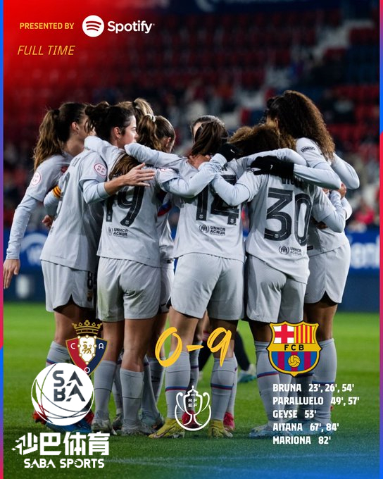 【足球外围平台sabasports】就在刚结束的西班牙女足王后杯赛事,巴萨女足9-0大胜奥萨苏纳女足,然而这一场赛事赛后却遭到了奥萨苏纳女足的投诉,原因是巴萨女足违规使用了原本应被禁赛的球员违反了规则,比赛可能会上演反转。据悉,Geyse去年夏天加盟巴萨女足,但她上赛季代表Madrid CFF的最后一场王后杯被罚下,本场需要停赛。奥萨苏纳女足已经正式提出上诉,巴萨则表示西班牙足协官网没有Geyse的停赛信息,因此不认同被投诉。 巴萨,巴萨女足 西班牙女足王后杯