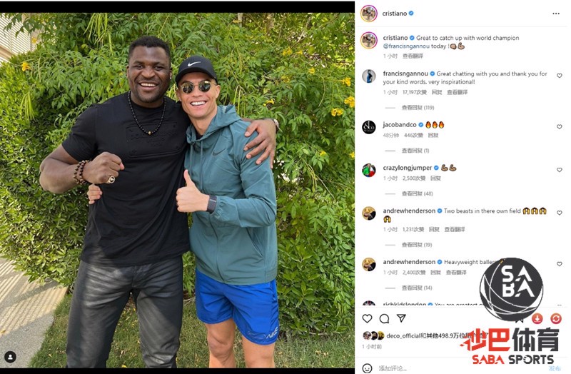 【足球外围平台sabasports】刚刚葡萄牙足球巨星现役沙特联利雅得胜利球员C罗(Cristiano Ronaldo)在社交平台上更新了社交动态,他晒出了自己与UFC冠军恩甘努的合影,照片中,恩甘努搂着C罗,C罗则对镜竖起了大拇指,两人看起来心情非常不错。C罗写道:“很高兴今天能与世界冠军恩甘努合影!”恩甘努是法国综合格斗运动员,也是C罗的忠实粉丝,两人经常在社交平台上有过互动。 C罗,世界杯,西班牙 利雅得胜利 沙特联