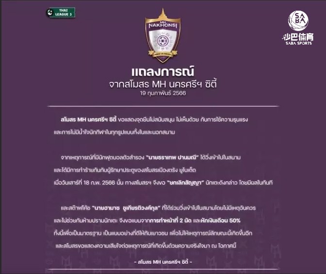 【足球外围平台sabasports】就在刚结束的泰超赛事,MH洛坤2-1击败芒庄联,一位MH洛坤球员Tharathep Panmanee在进球庆祝时,可能因为兴奋过度,无故击打对方门将,被红牌罚下。该事件引起了国内媒体关注,刚刚MH洛坤官方就发布了最新消息,宣布已经与Tharathep Panmanee解约,俱乐部表示不会容忍这样的恶性事件,并且向芒庄联门将进行了致歉。 MH洛坤 泰超,拉查武里