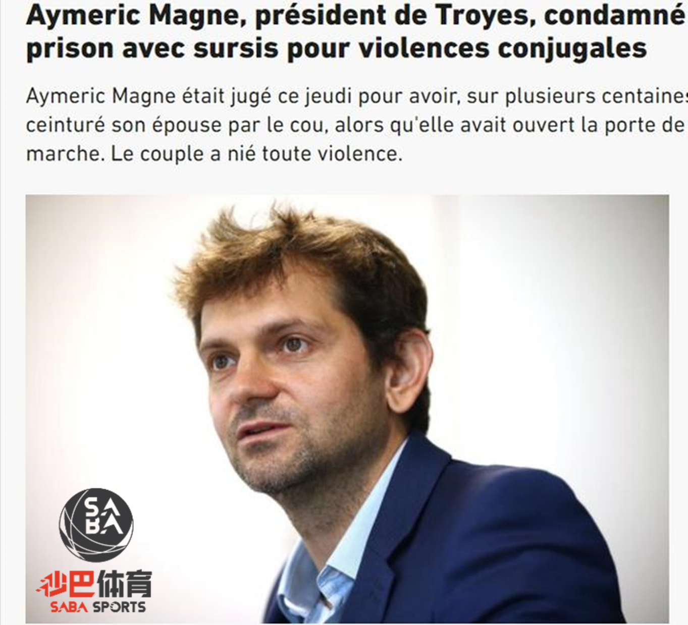 [足球外围平台sabasports]日前,特鲁瓦主席马格纳因为涉嫌家暴,被当地法院判处3个月的缓刑,并处以1500欧元罚款。马格纳被指控在去年10月29日晚驾车回家时,从后卡住妻子的脖子行驶了数百米。
