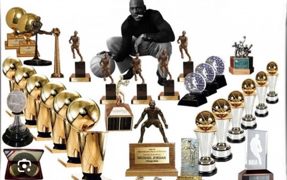 在这张图中,乔丹的辉煌成就一览无遗:5座常规赛MVP奖杯、6座NBA总冠军奖杯、6座总决赛FMVP奖杯、1座DPOY最佳防守球员奖杯、3座全明星MVP奖杯,以及两枚象征至高荣誉的奥运金牌。如此荣誉堆叠,不仅展现了他统治赛场的能力,也进一步巩固了其“篮球之神”的地位。