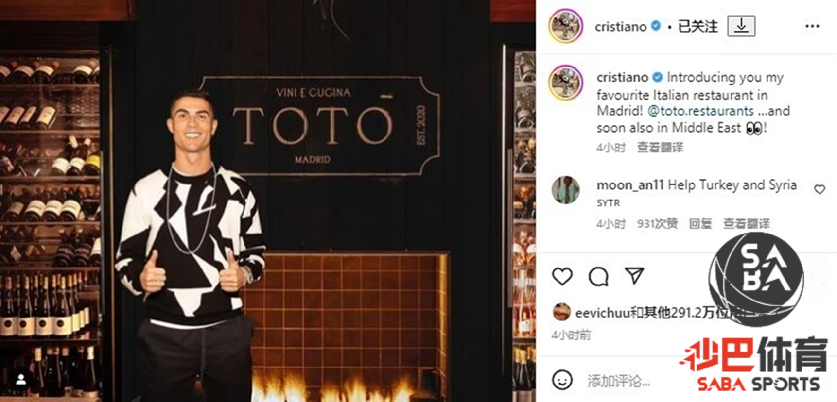 【足球外围平台sabasports】刚刚现役沙特联利雅得胜利球星C罗(Cristiano Ronaldo)在社交平台更新了社交动态,他晒出了自己在沙特开的一家属于自己的新店TOTO,C罗成为了全球连锁饭店TOTO的加盟商。值得一提的是,这一家饭店是C罗与好友西班牙球星网球巨星纳达尔和西班牙篮球巨星加索尔一起合伙开设的,里面有着这三位顶级球星的元素,可谓星光熠熠。TOTO是意大利餐厅,主打意大利菜,在意大利国内拥有高知名人气,是一家全球餐饮连锁。 C罗,世界杯,西班牙 利雅得胜利 沙特联